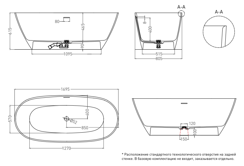 | Оснащение | Интегрированный слив-перелив, сифон, донный клапан Click-Clack в цвета ванны |