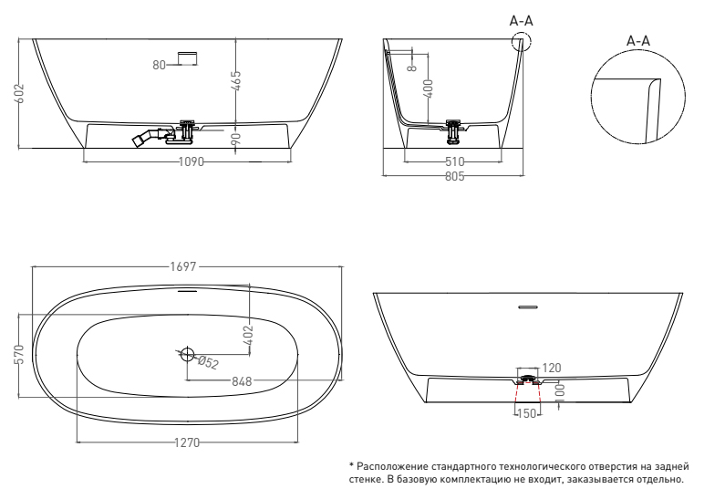 | Оснащение | Интегрированный слив-перелив, сифон, донный клапан Click-Clack в цвета ванны |