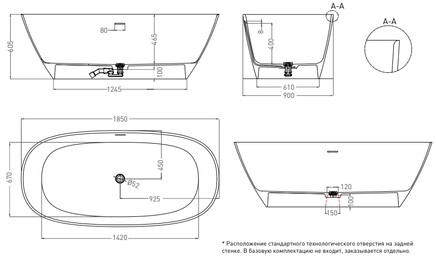 | Оснащение | Интегрированный слив-перелив, сифон, донный клапан Click-Clack в цвета ванны |