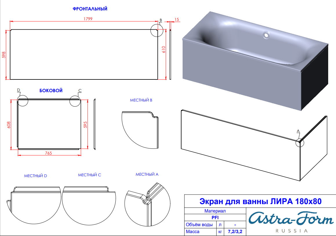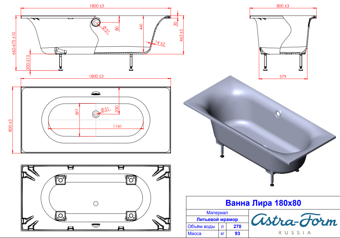 Ванна из литьевого мрамора Astra-Form Лира 180х80 см, с ножками 01010029