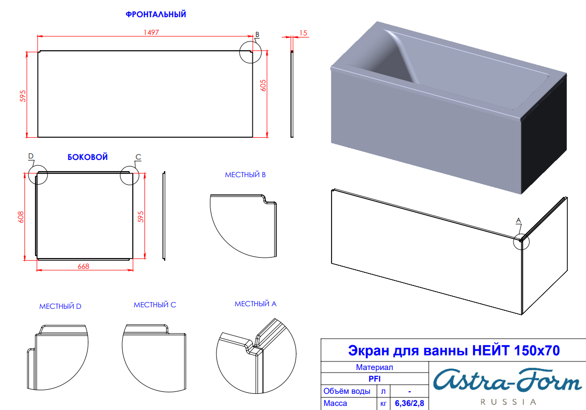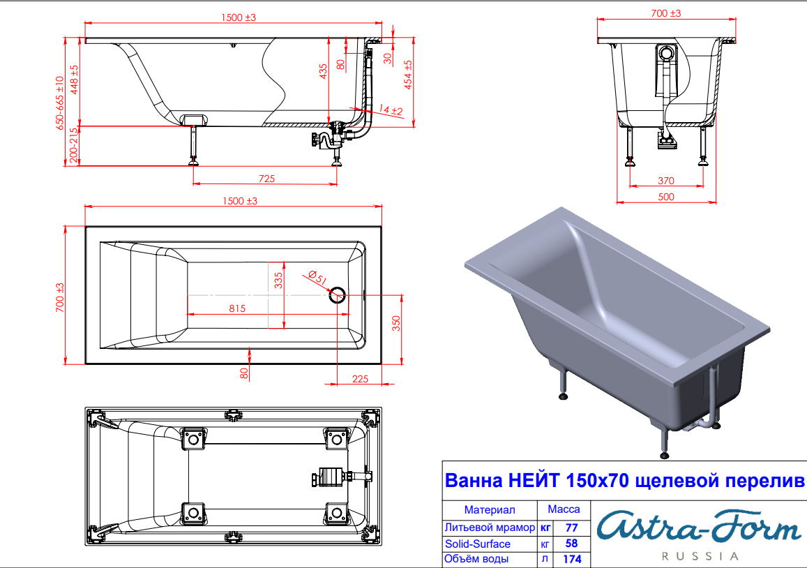 Ванна из литьевого мрамора Astra-Form Нейт 150х70 см с щелевым переливом 01010004