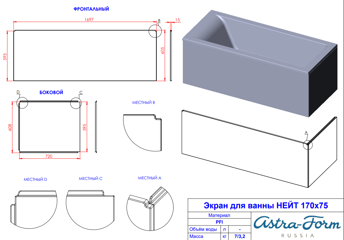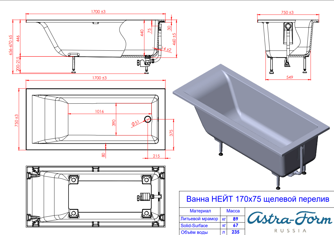 Ванна из литьевого мрамора Astra-Form Нейт 170х75 см с щелевым переливом 01010046