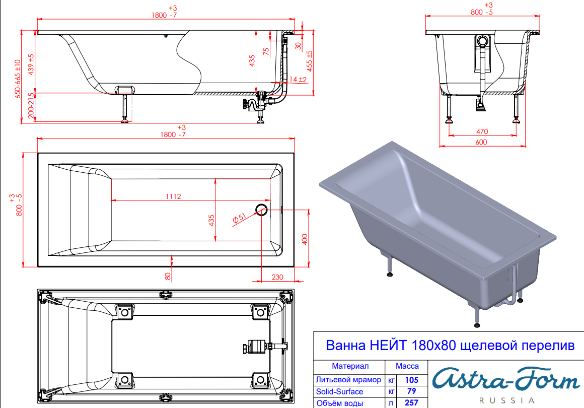 Ванна из литьевого мрамора Astra-Form Нейт 180х80 см с щелевым переливом 01010035