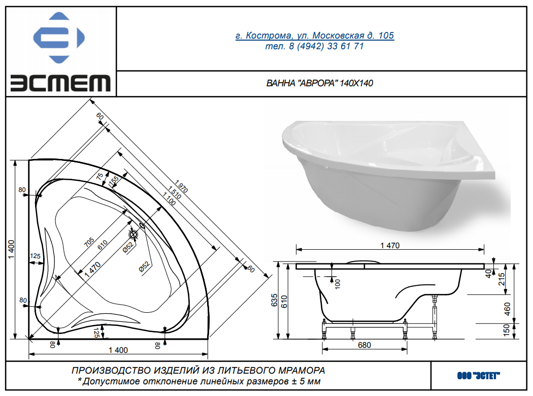 Ванна из литьевого мрамора Эстет Аврора 140x140 см белый глянец ФР-00002601