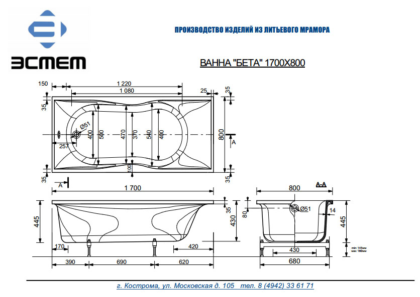Ванна из литьевого мрамора Эстет Бета 170x80 см белый глянец ФР-00001321