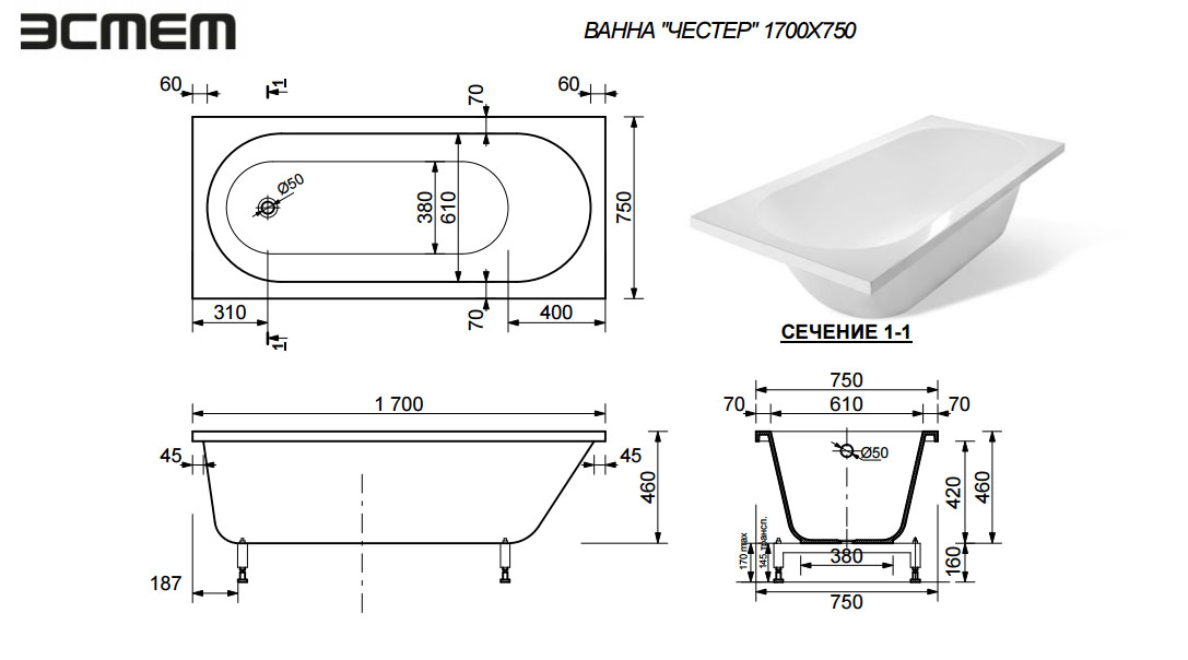 Ванна из литьевого мрамора Эстет Честер 170x75 см белый глянец ФР-00000692