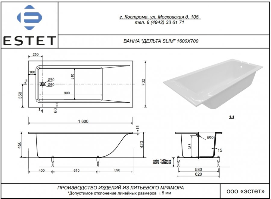 Ванна из литьевого мрамора Эстет Дельта А Slim 160x70 см (тонкий борт) белый глянец ФР-00015334