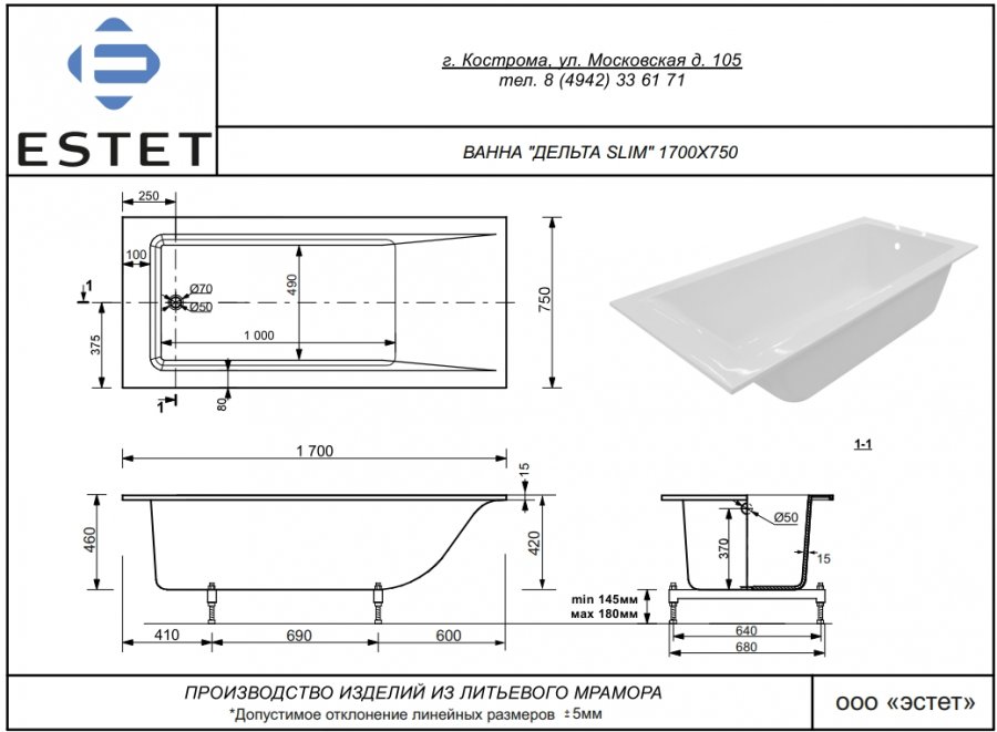 Ванна из литьевого мрамора Эстет Дельта B Slim 170x75 см (тонкий борт) белый глянец ФР-00015336