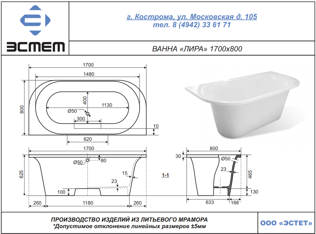 Ванна из литьевого мрамора Эстет Лира 170х80 см белый глянец ФР-00001912