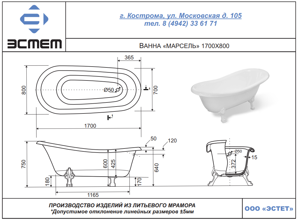 Ванна из литьевого мрамора Эстет Марсель 170x80 см белый глянец ФР-00001849