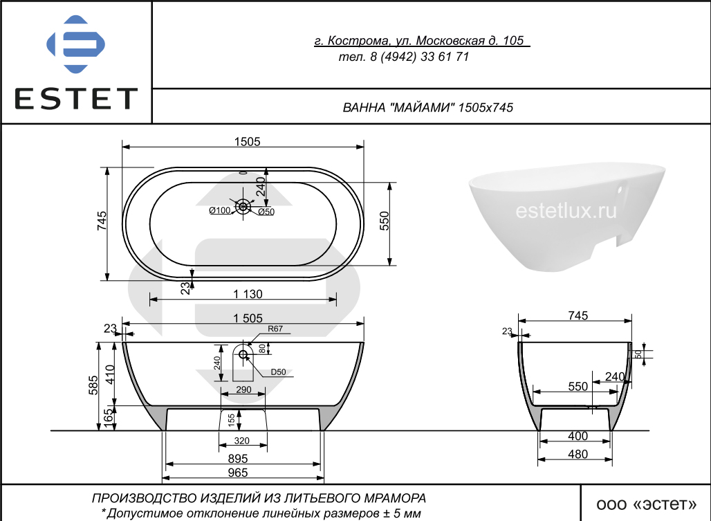 Ванна из литьевого мрамора Эстет Майами 150x75 см белый глянец ФР-00016604