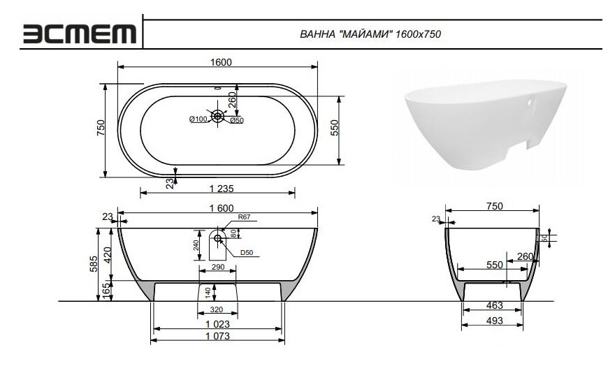 Ванна из литьевого мрамора Эстет Майами 160x75 см белый глянец ФР-00009623