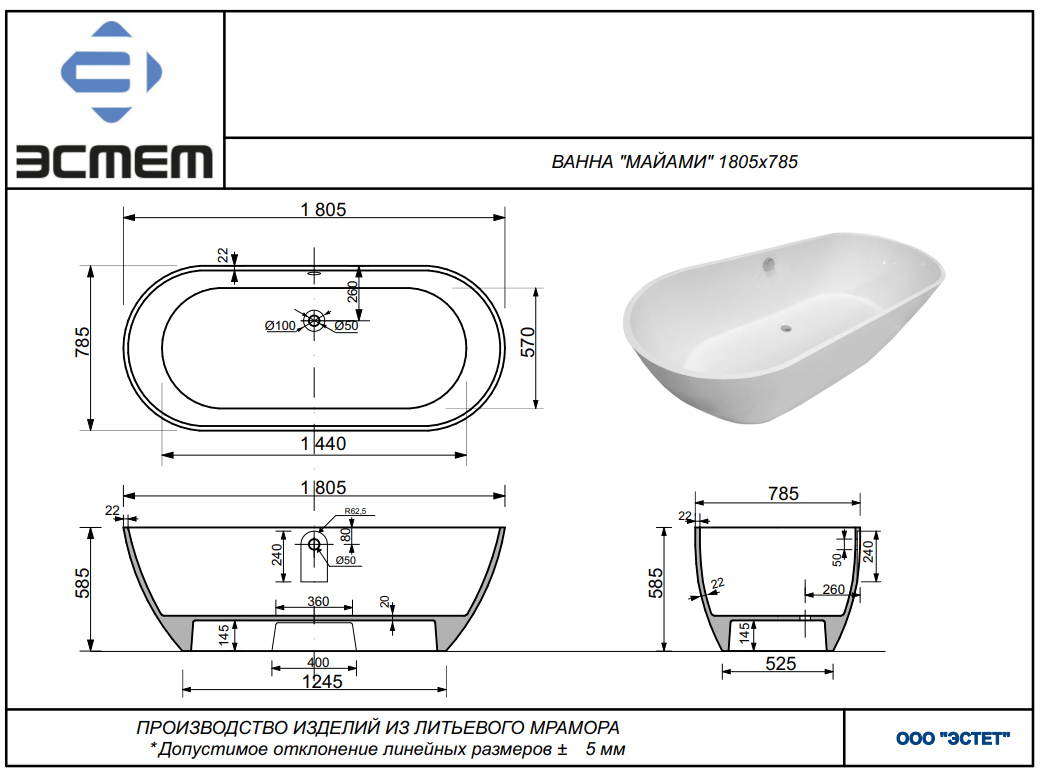 Ванна из литьевого мрамора Эстет Майами 180,5x78,5 см белый глянец ФР-00006013