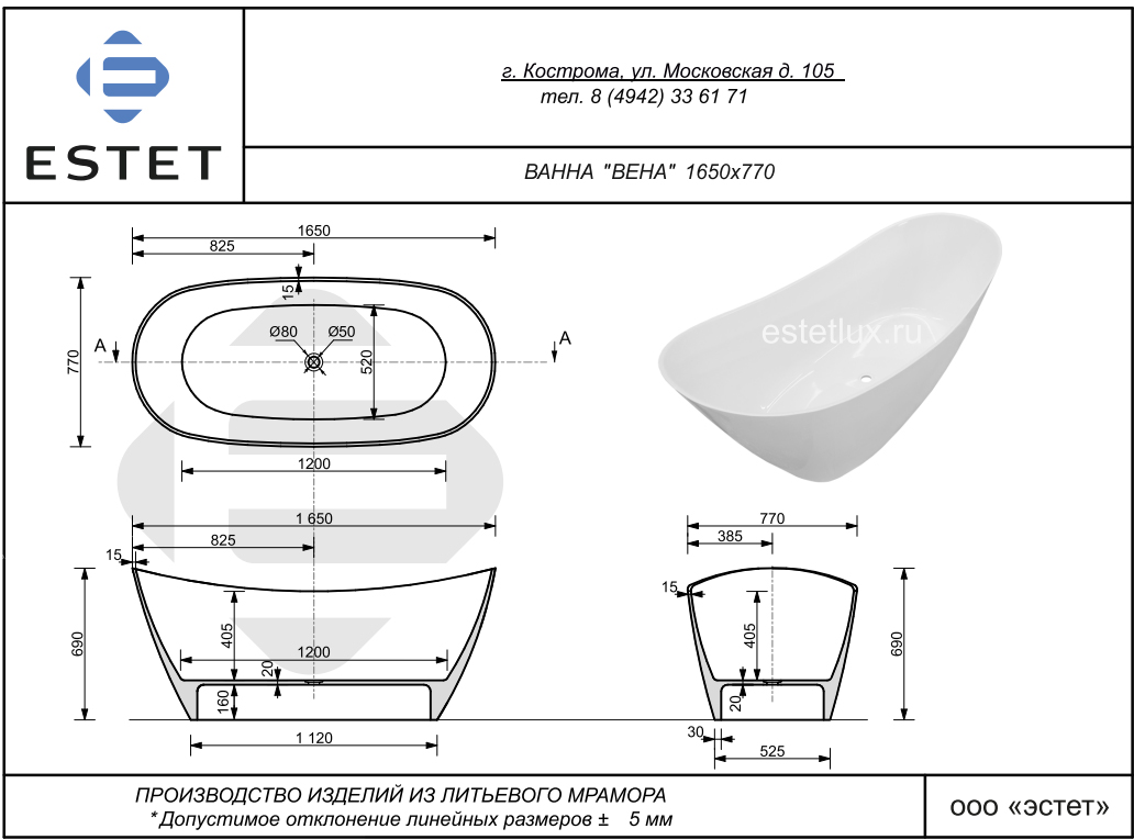 Ванна из литьевого мрамора Эстет Вена Silk 165x77 см белый матовый ФР-00018273