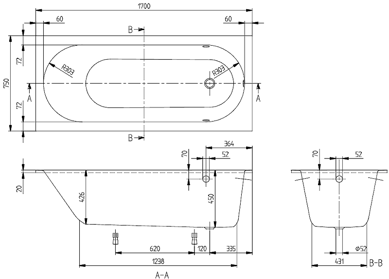 Прямоугольная квариловая ванна Villeroy&Boch Oberon Solo 170х75 с ножками UBQ170OBE2V-01