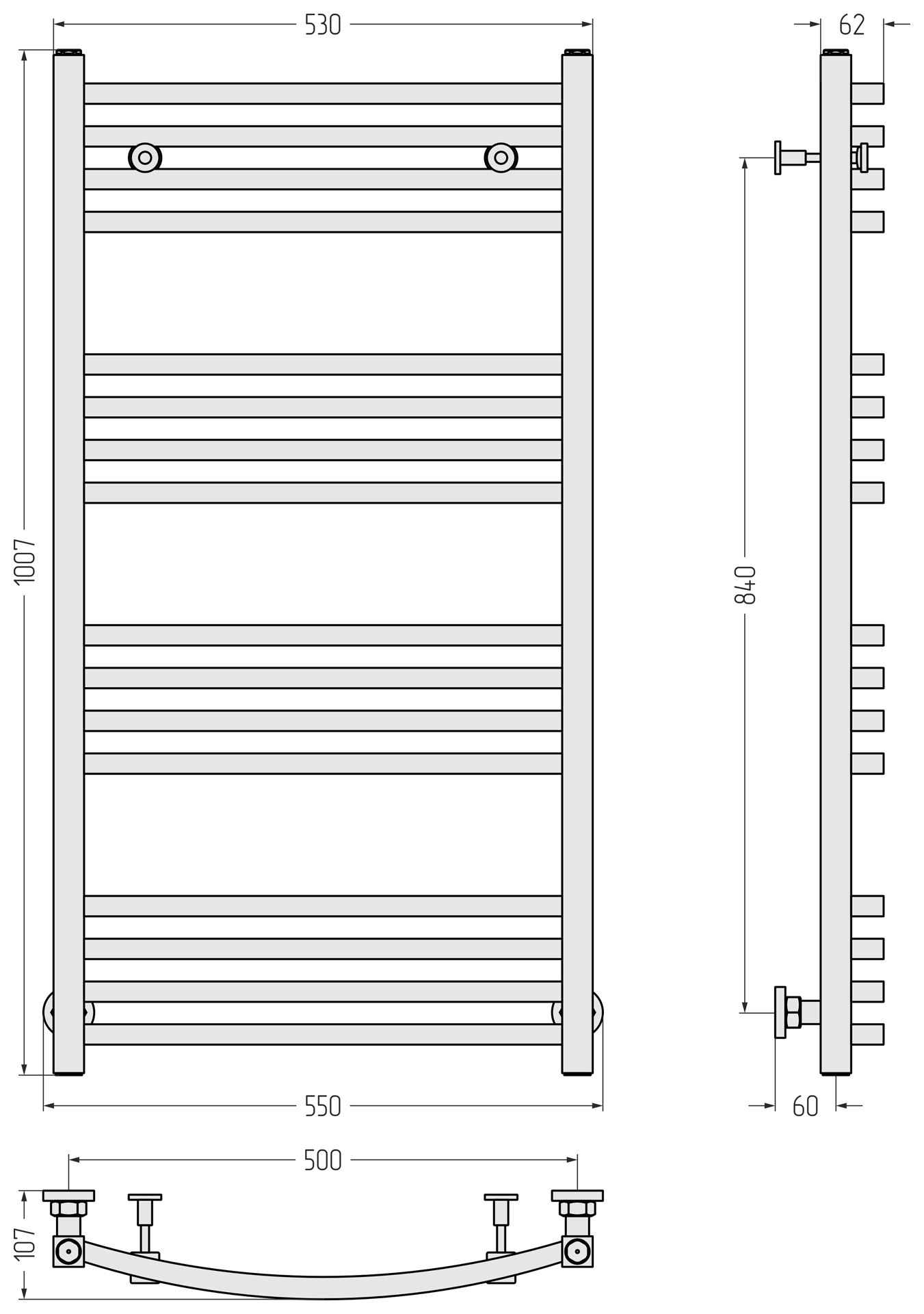 В стандартной комплектации есть всё необходимое для нижнего подключения полотенцесушителя «в стену» или «в пол». Вертикальное и диагональное подключение Аркуса возможно, но только через запорно-регулирующую арматуру Сунержа®, которая приобретается отдельно.
