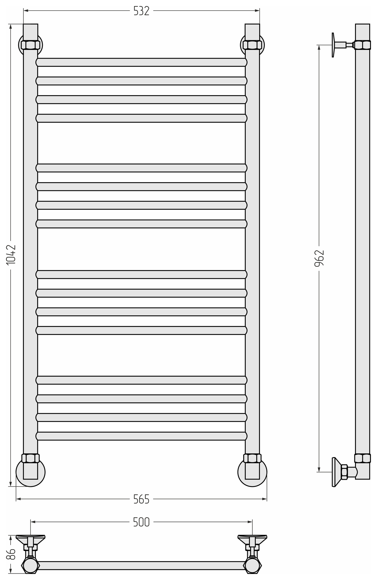 В комплекте есть всё необходимое для установки полотенцесушителя на стену и его подключения к системе горячего водоснабжения.
