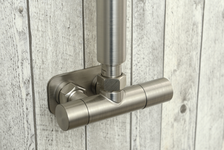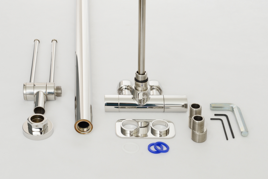 В комплект входит всё необходимое для нижнего подключения полотенцесушителя «в стену» – запорно-регулирующий угловой вентиль EU50 с межосевым расстоянием 50 мм.