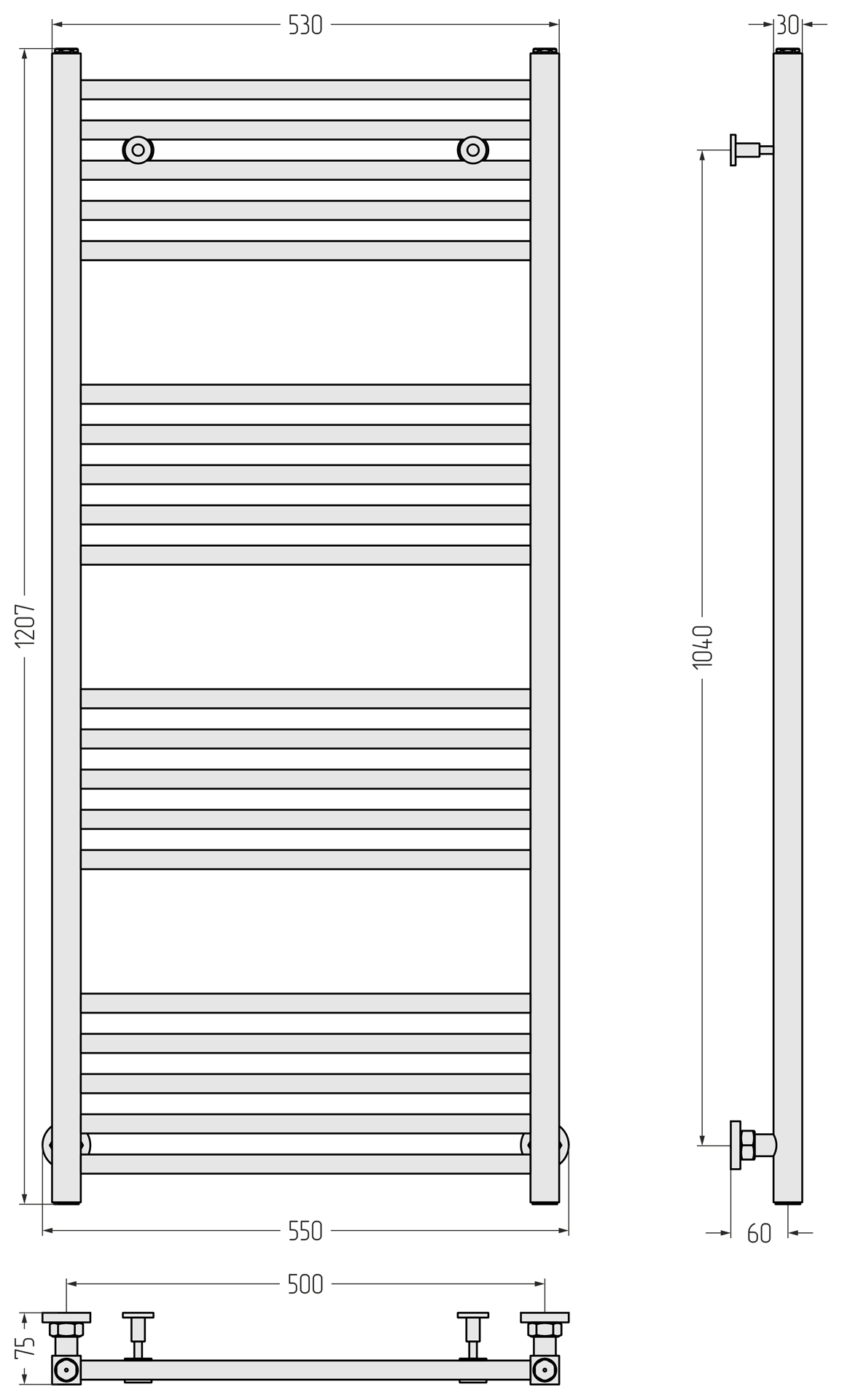 В стандартной комплектации есть всё необходимое для нижнего подключения полотенцесушителя «в стену» или «в пол». Вертикальное и диагональное подключение Модуса возможно, но только через запорно-регулирующую арматуру Сунержа®, которая приобретается отдельно