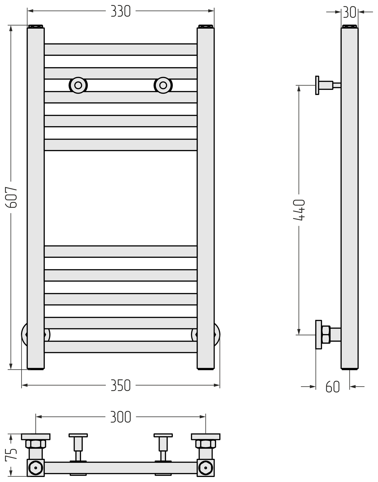 В стандартной комплектации есть всё необходимое для нижнего подключения полотенцесушителя «в стену» или «в пол». Вертикальное и диагональное подключение Модуса возможно, но только через запорно-регулирующую арматуру Сунержа®, которая приобретается отдельно