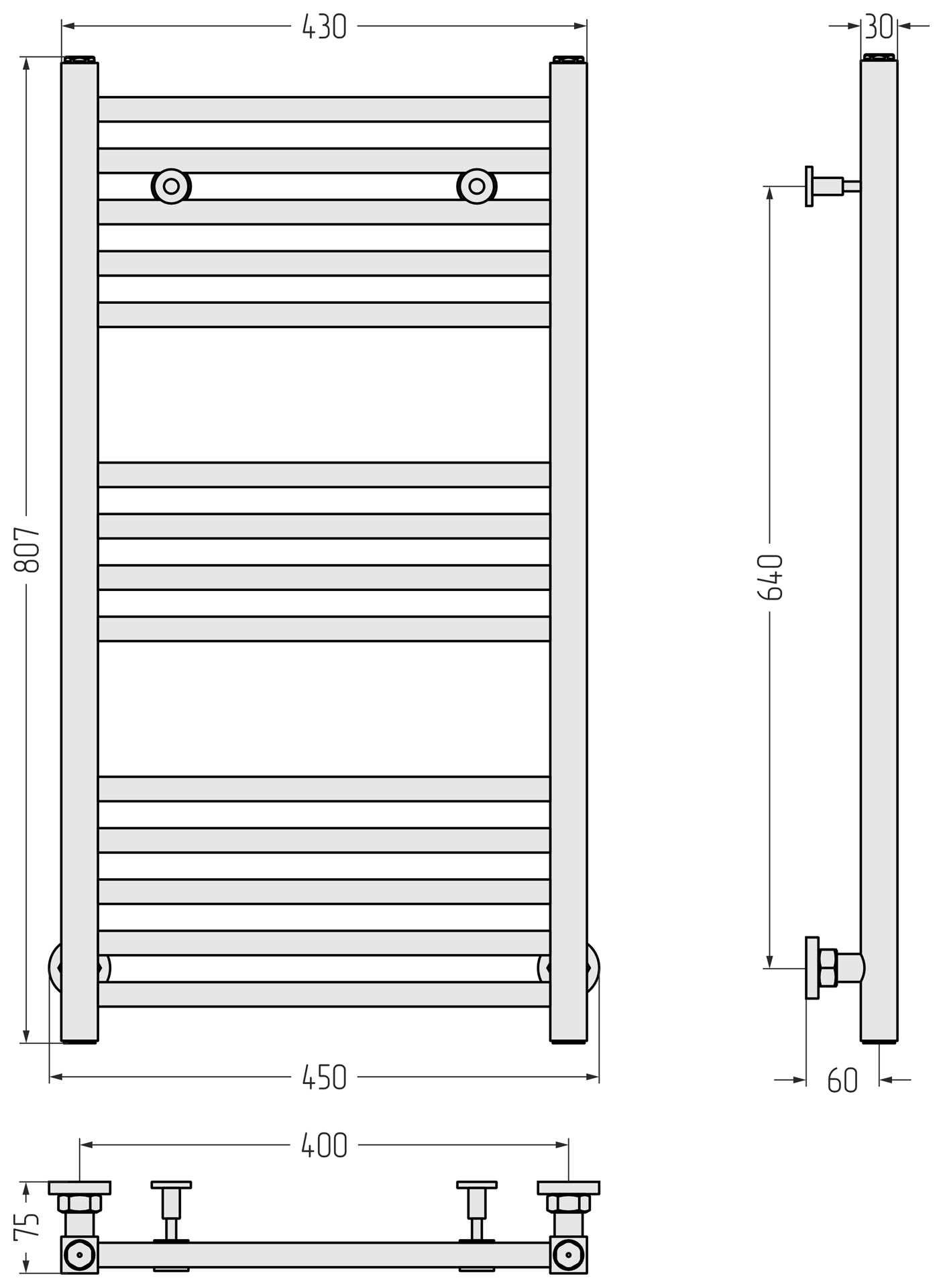 В стандартной комплектации есть всё необходимое для нижнего подключения полотенцесушителя «в стену» или «в пол». Вертикальное и диагональное подключение Модуса возможно, но только через запорно-регулирующую арматуру Сунержа®, которая приобретается отдельно