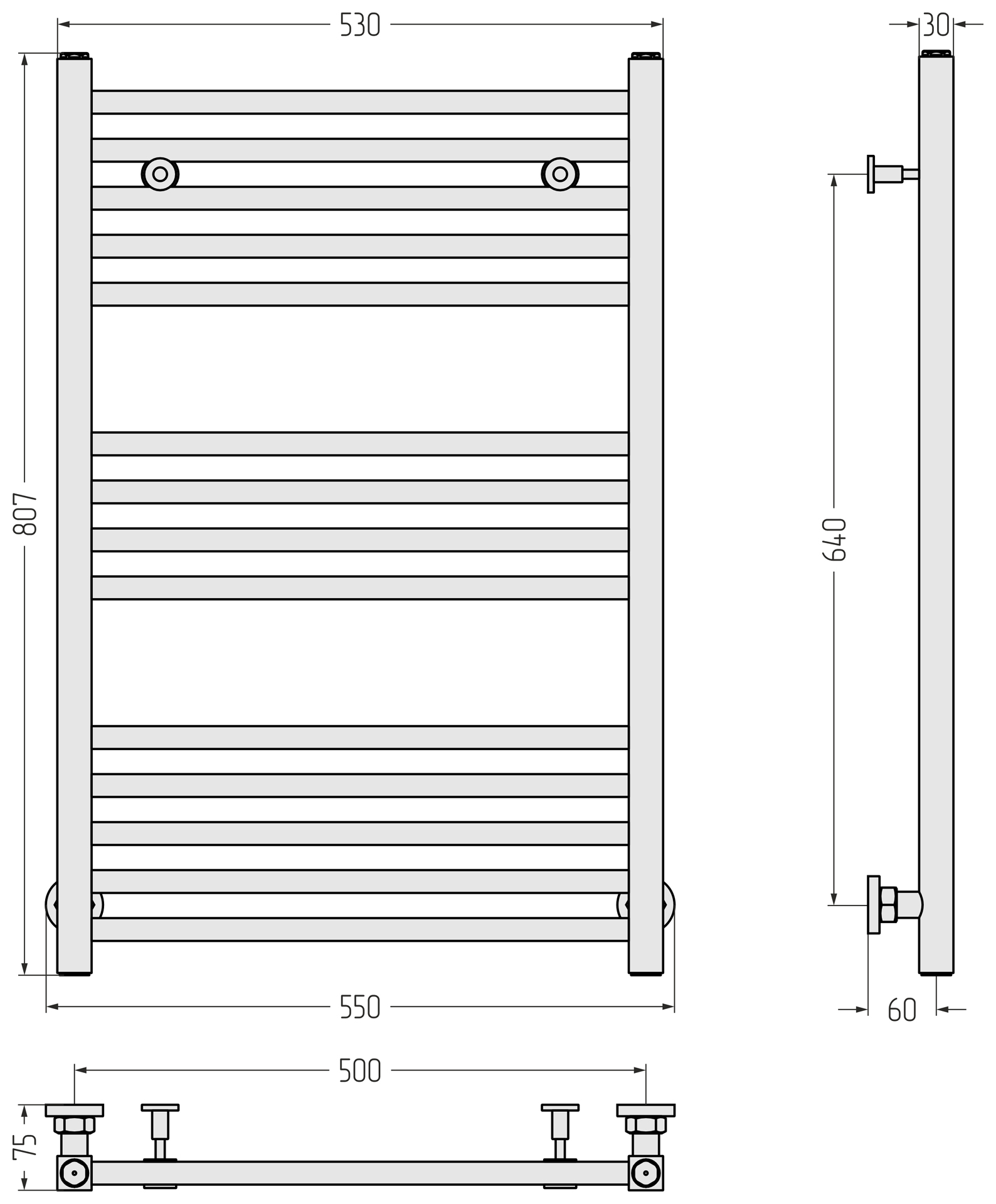 В стандартной комплектации есть всё необходимое для нижнего подключения полотенцесушителя «в стену» или «в пол». Вертикальное и диагональное подключение Модуса возможно, но только через запорно-регулирующую арматуру Сунержа®, которая приобретается отдельно