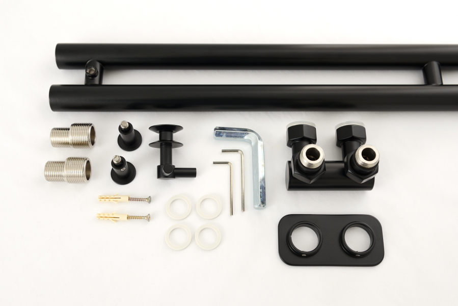 В комплект входит всё необходимое для нижнего подключения полотенцесушителя «в стену» – угловой модуль EU50 с межосевым расстоянием 50 мм. Нюанс EU50+ можно установить и горизонтально, получив удобную греющую полочку для полотенец.
