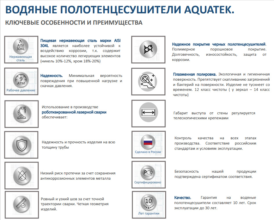 • Энергонезависимость: водяной полотенцесушитель Aquatek не требует подключения к электросети.