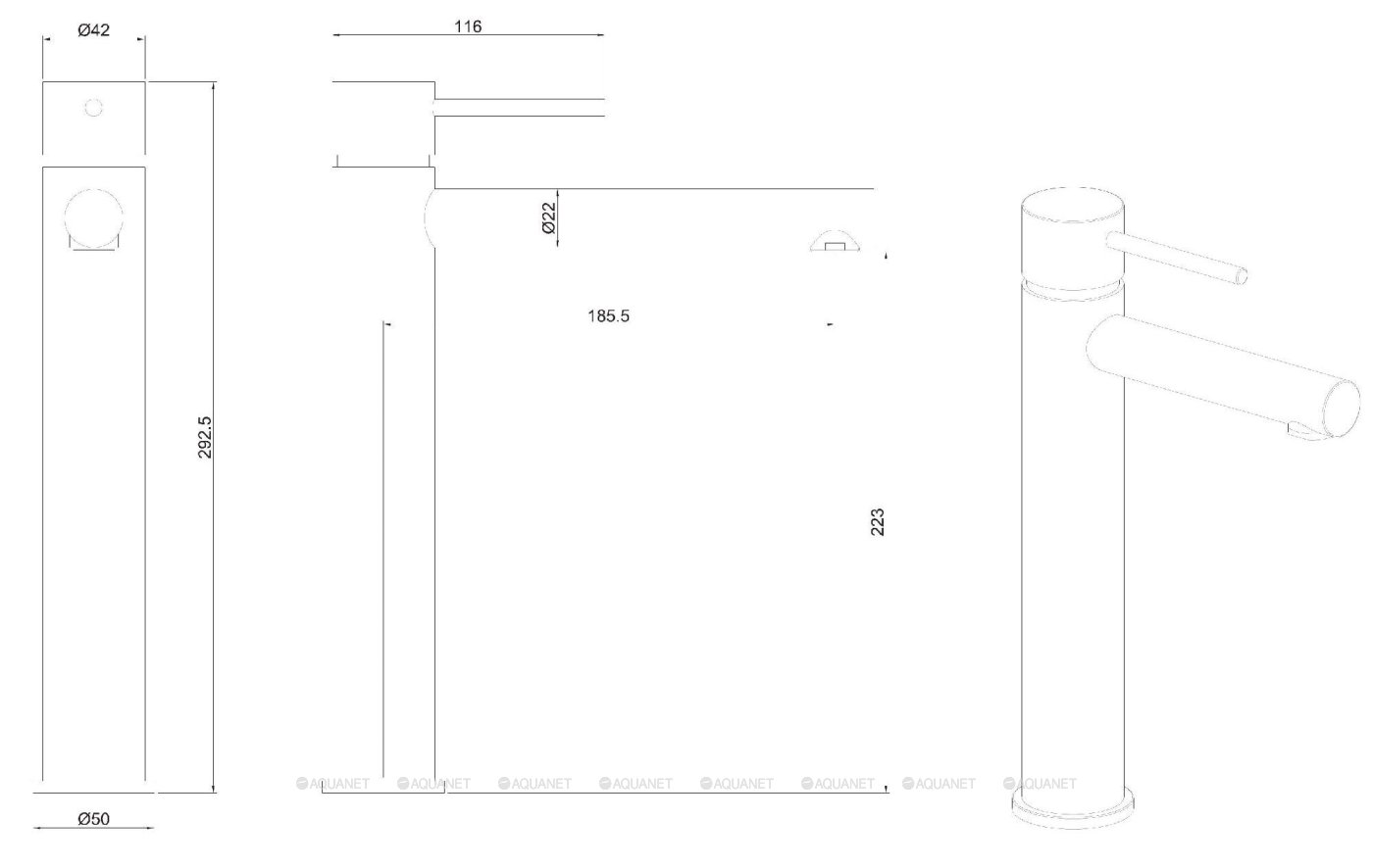 Для управления напором и температурой используют тонкий рычаг, расположенный в верхней части модели. Смеситель оснащен керамическим картриджем — запорным механизмом, позволяющим смешивать потоки горячей и холодной воды. Фиксированный излив длиной 185 мм и высотой 223 мм обладает традиционной формой. Простота и легкость подключения к водопроводу достигается за счет гибкой подводки, входящей в комплект поставки.