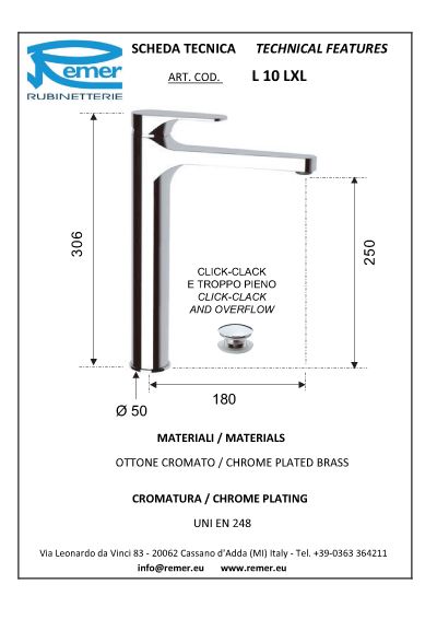 Высокий смеситель для раковины с д/к Remer Class Line L10LXL