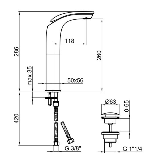 - Комплектация: смеситель, подводка, донный клапан