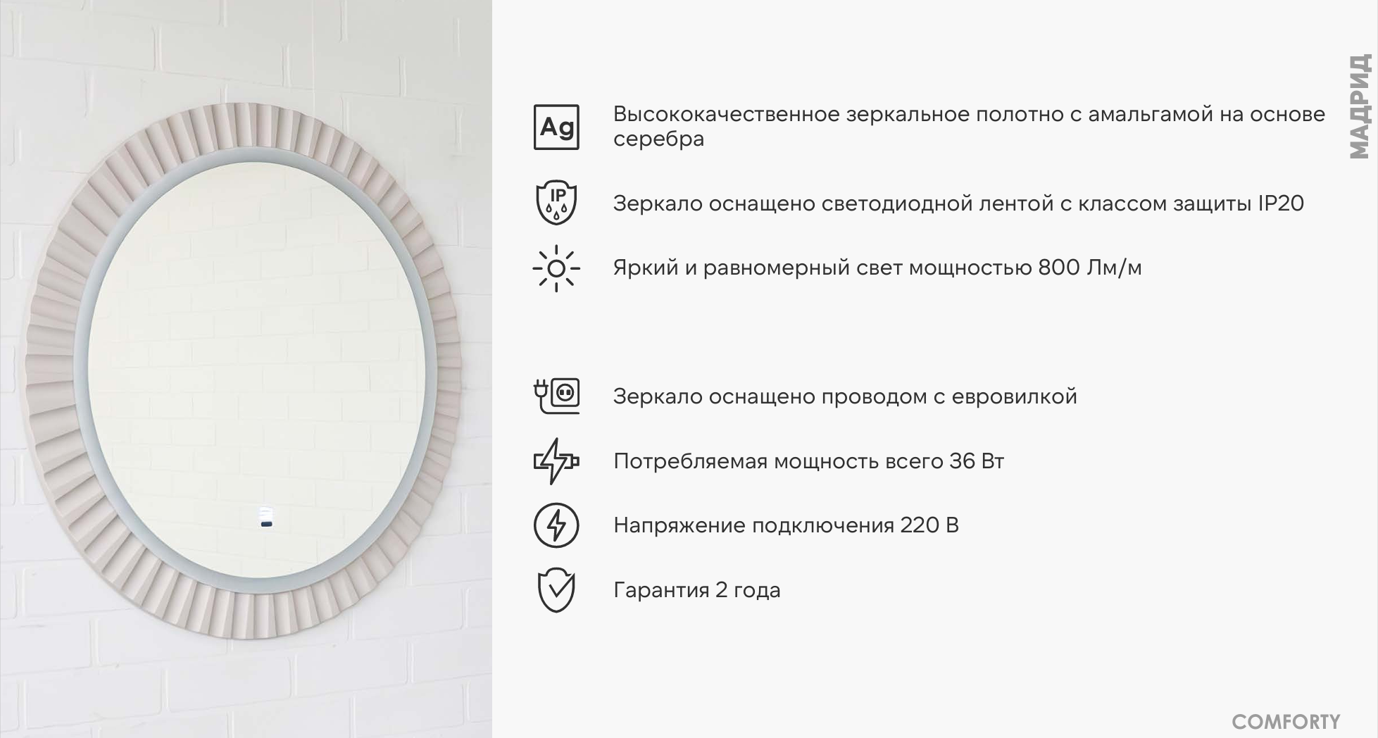 Зеркало с подсветкой антизапотевание Comforty Мадрид 90 см белый глянец 00-00014166