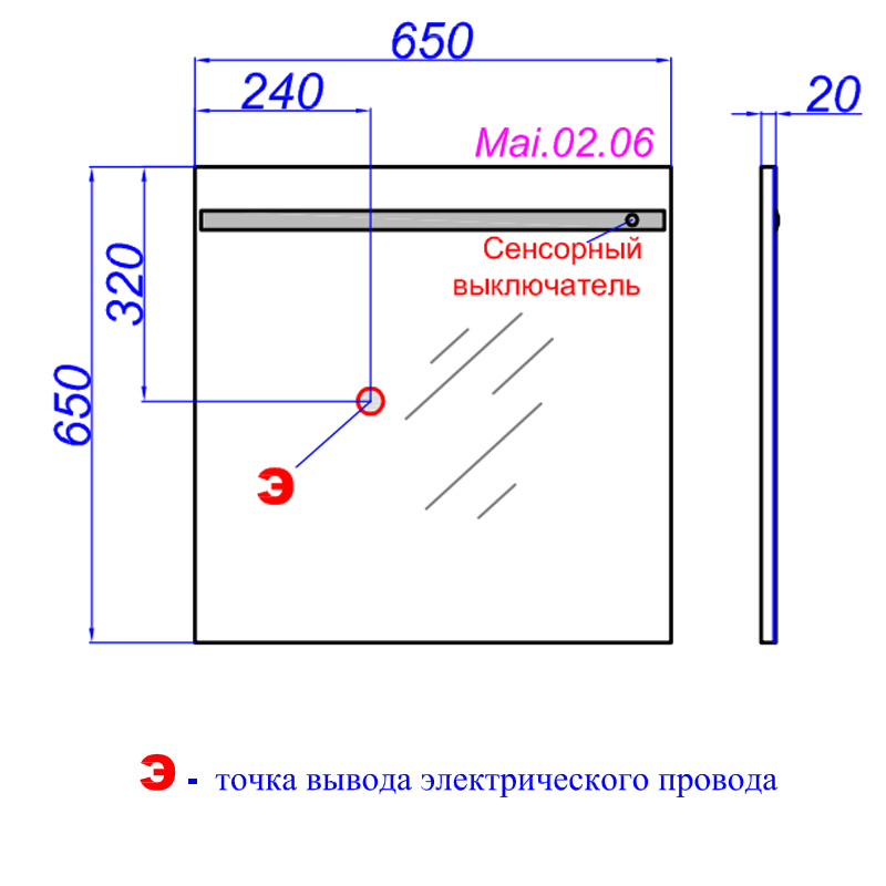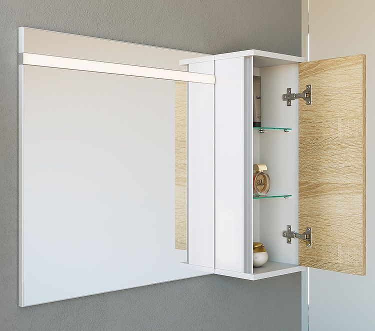 - Зеркальная панель оснащена встроенной светодиодной подсветкой с сенсорным выключателем. Зеркало может крепиться как с вертикальным положением подсветки, так и горизонтальным. Таким образом подсветка может находиться сбоку или сверху. Шкафчик с дверью на петлях с доводчиком может быть установлен слева или справа относительно зеркальной панели.