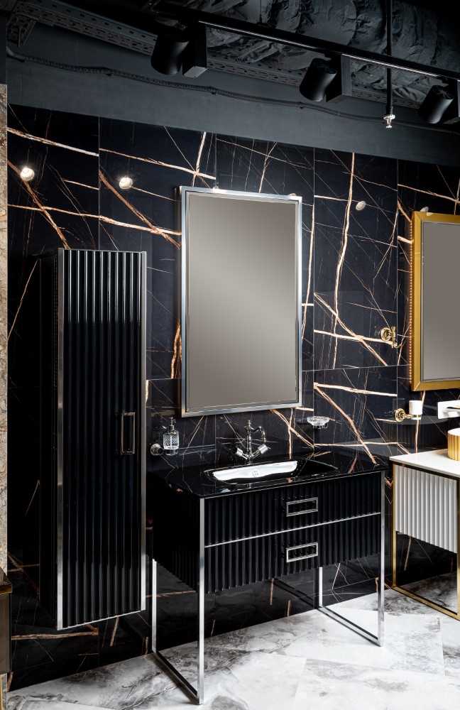 Алюминиевые ножки и ручки возможны в цветах золото и хром. Размерный ряд коллекции Monaco состоит из 80 см, 100 см и 160 см (на 2 чаши-раковины).