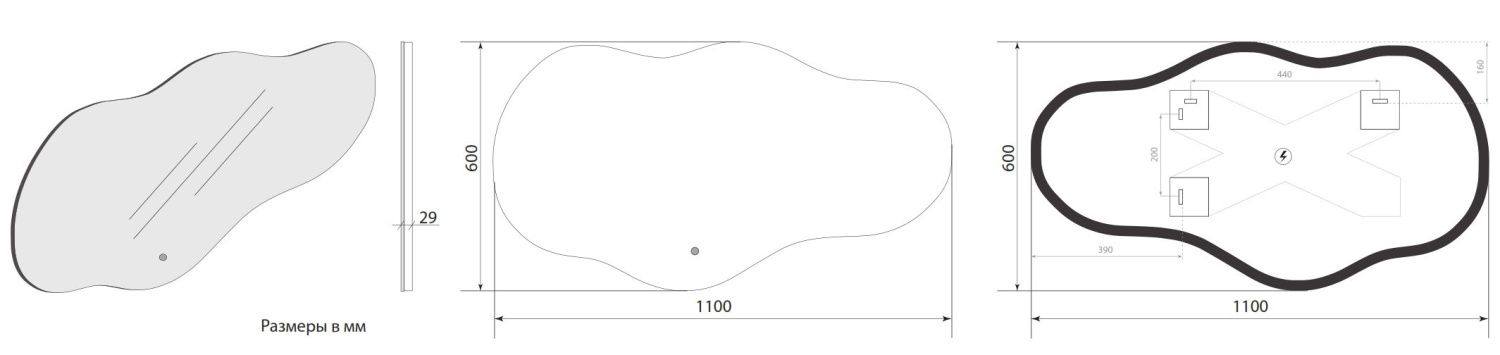 - Подсветка активируется на взмах руки в 3-5 см от сенсора, расположенного на зеркальном полотне.