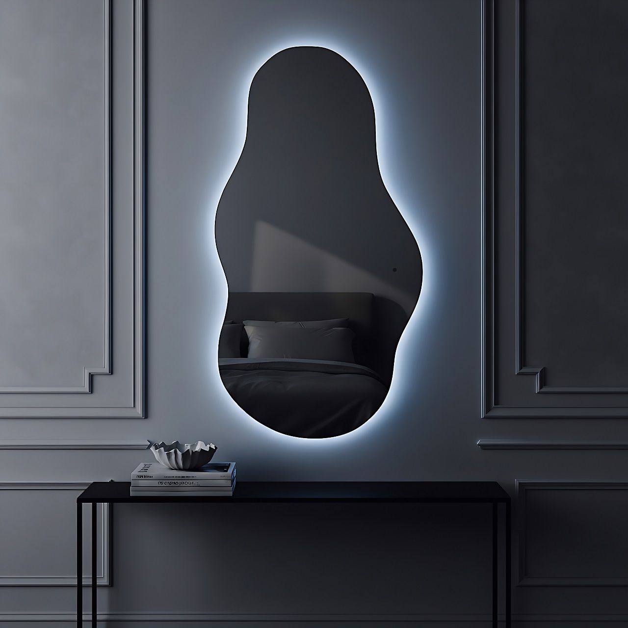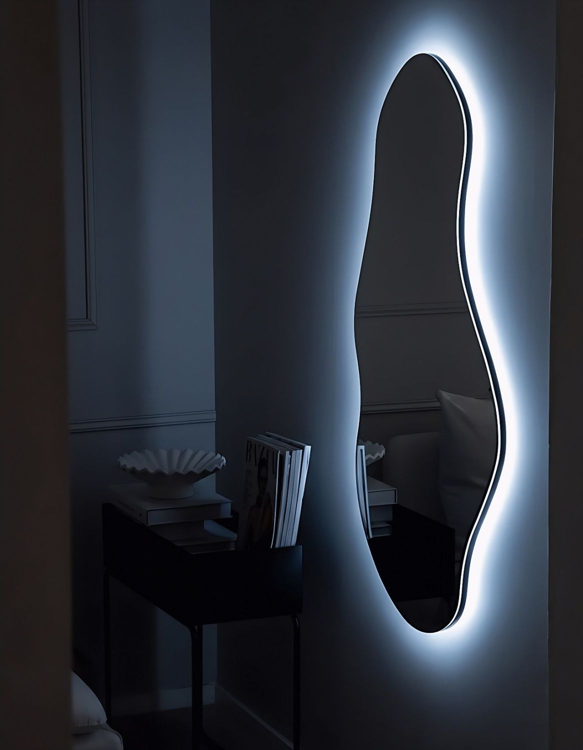 - Зеркало креативной формы для ванной комнаты и интерьеров, оснащенное светодиодной LED подсветкой с диммером.