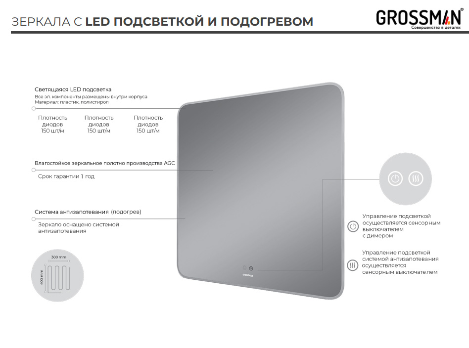 | Особенности | LED подсветка 4000К/ сенсорный выключатель/ подогрев |