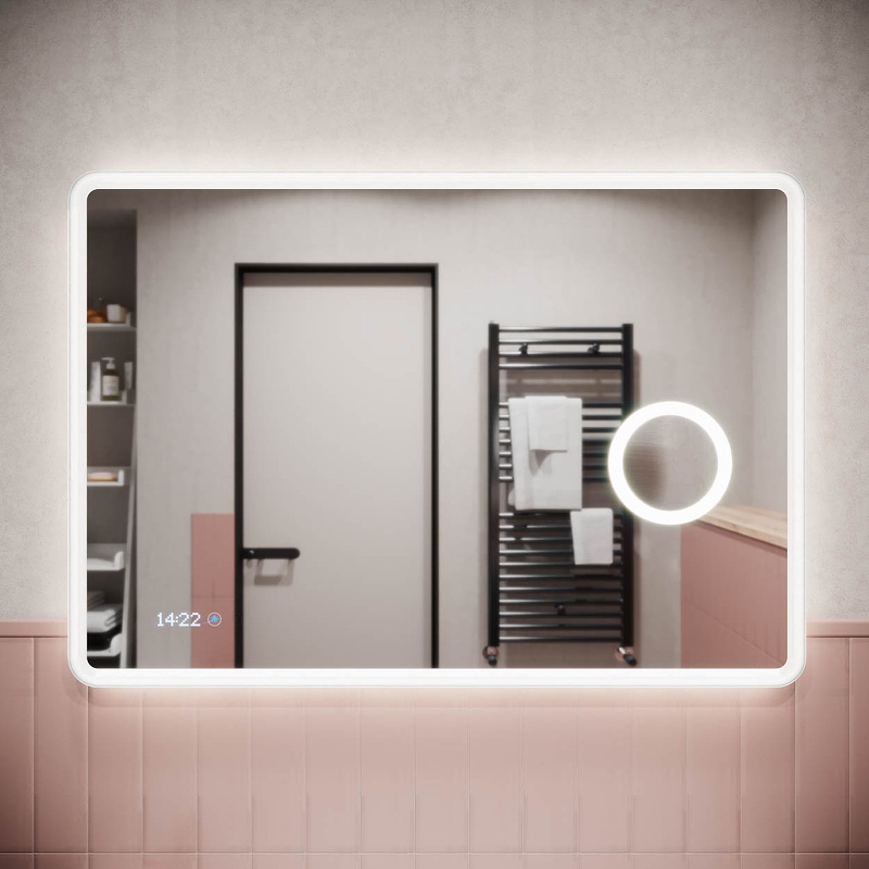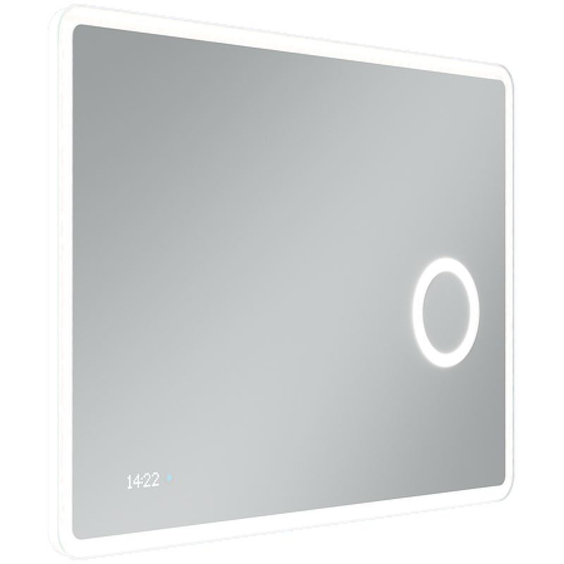 Комплектация: LED подсветка; димируемый сенсорный выключатель; встроенное увеличительное зеркало (линза) с 3-х кратным увеличением, дополнительная подсветка вокруг линзы; встроенные часы,пластиковый светопропускающий короб