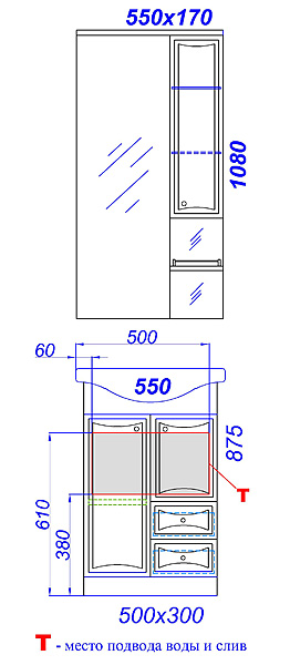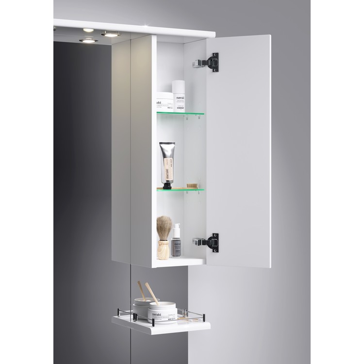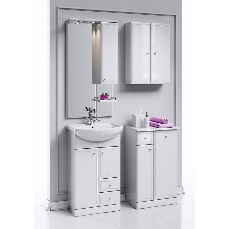 Комплектация: полочка, шкафчик, светодиодная подсветка, выключатель, розетка