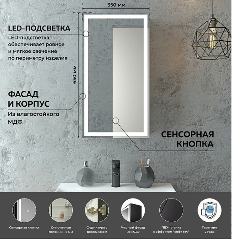 | Оснащение | Подсветка, Розетка, Сенсор |